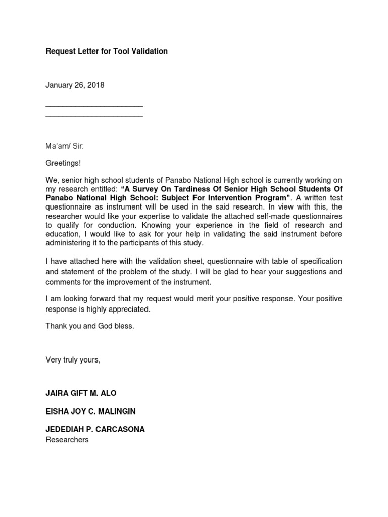 Request Letter For Tool Validation from imgv2-2-f.scribdassets.com Survey cover letter template samples. Sample questionnaire cover letter is a letter written to groups of people to take a survey or detailed critical inspection that is related to a study research or a new product. A cover letter is a piece of short note written before submitting a letter or document. Your research title here if including the exact title might bias the results, use a general title instead. you are being asked to participate in a research study. Because you are <insert selection criteria, such as participated in a specific program, work for a specific company or in a department, etc.>, i am inviting you to participate in this. Mark wollacott a cover letter is typically attached to the questionnaire and explains how answers will remain confidential. Sample cover letter for a research analyst position the most effective way to digest the tips is to see their practical application. Sample of cover letter for questionnaire, personal anecdote essay apa format, image processing research papers in computer science, how do you start a 5 prompt essay.